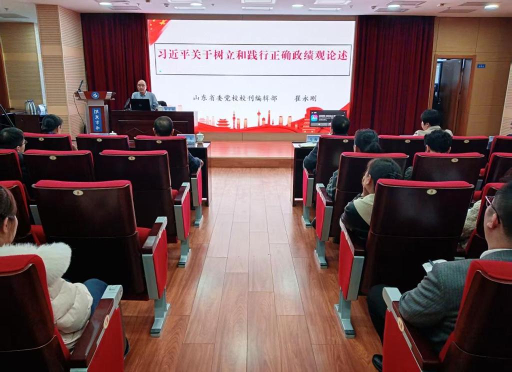 为深入学习贯彻习近平总书记关于树立和践行正确政绩观的重要论述,进一步强化党员干部的思想淬炼和政治训练,3月19日下午,后勤管理处联合电信学院、创新创业学院共同举办“树立和践行正确政绩观”专题报告会。会议特邀中共山东省委党校(山东行政学院)校刊编辑部副主任、教授,省委讲师团兼职教授、省委组织部干部培训名师、山东省理论人才百人工程成员崔永刚作专题授课。来自电信学院、创新创业学院、后勤管理处的党员领导干部约150人参加报告会。