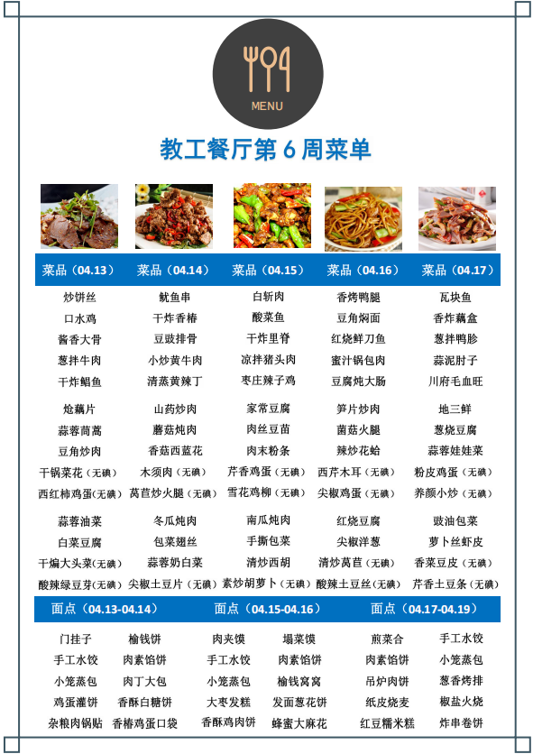 教工餐厅第六周菜单
